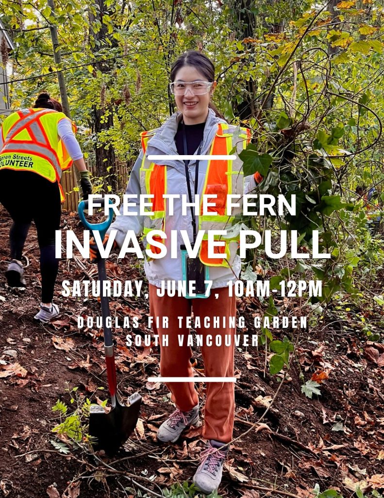You can participate by volunteering with local stewardship group, Free the Fern, in South East Vancouver. They will be hosting an Invasive Pull on Saturday, June 7, 10am-12pm at the Douglas Fir Teaching Garden (east of 3530 Swansacre, Vancouver). All ages and abilites are welcome to gather to remove invasive plants from along the Champlain Heights Trail system. Gloves, tools, and refreshments provided.