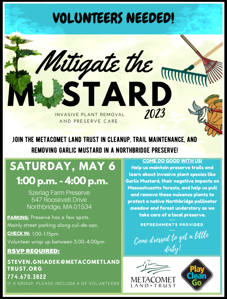 Join the Metacomet Land Trust in cleanup, trail maintenance, and removing garlic mustard in a Northbridge preserve! Help us maintain preserve trails and learn about invasive plant species like garlic mustard, their negative impacts on Massachusetts forests, and help us pull and remove these nuisance plants to protect a native Northbridge pollinator meadow and forest understory as we take care of a local preserve. RSVP to .